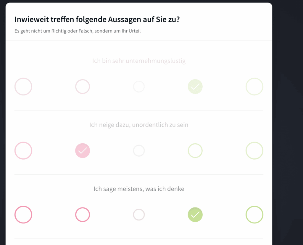 Der Fragebogen erfasst fünf Grunddimensionen: Offenheit für neue Erfahrungen, Gewissenhaftigkeit, Extraversion, Verträglichkeit und emotionale Stabilität. Zusätzlich werden Ihre Werte, Erwartungen an eine Partnerschaft und Lebensziele abgefragt. Die Fragen reichen von Selbsteinschätzungen bis hin zu situativen Szenarien.