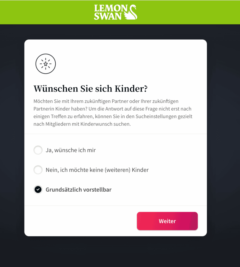 Ihre Antworten zeigen, dass LemonSwan perfekt zu Ihnen passt. Diese Partnervermittlung wurde speziell für ernsthafte Singles entwickelt und bietet wissenschaftlich fundiertes Matching mit persönlicher Betreuung.
