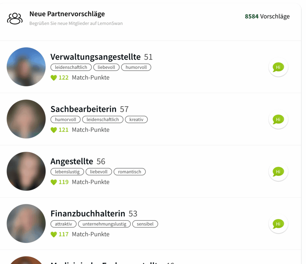 LemonSwan schützt die Identität seiner Mitglieder durch anonyme Chiffren anstelle von Klarnamen. Profilfotos werden standardmäßig verpixelt dargestellt und erst nach individueller Freigabe sichtbar. Sie behalten damit die volle Kontrolle darüber, wer Sie sehen kann.