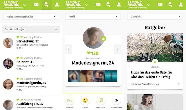 Super Plattform! Dank LemonSwan habe ich meinen Partner gefunden. Der Persönlichkeitstest hat absolut zu meinen persönlichen Eigenschaften gepasst und die Matching Ergebnisse haben mir einen Partner vorgeschlagen der nun mein Partner ist. Natürlich ist die Plattform noch nicht zu 100% ausgereift, aber sie sorgt für eine tolle alternative zu Parship und Elitepartner und überzeugt mich persönlich. Ich habe mich ernst genommen gefühlt und hatte auch das Gefühl, dass meine Partnervorschläge durchweg ernste Absichten hatten. Danke LemonSwan !